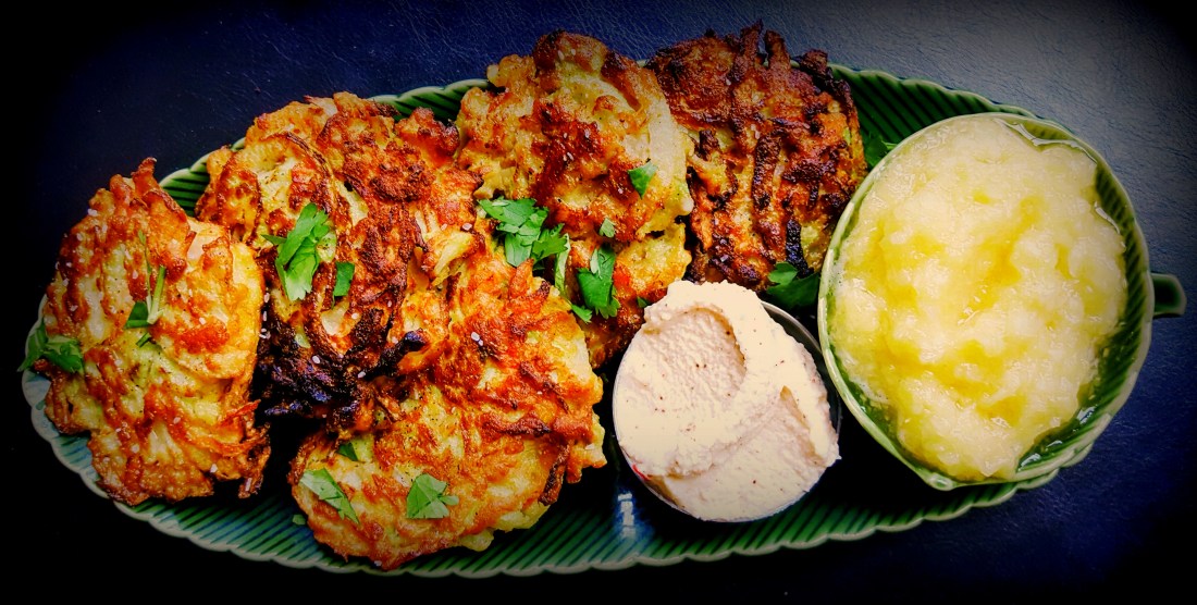 This Cinco De Mayo inspired effort is probably a cultural abomination of sorts, but in my defense I have seen something similar served at a top notch taqueria in Downtown Miami. Plus, there is a recipe circulating on the Internet, so it is not that far-fetched. Grated, or spiraled chayote (a rather tasteless plant), grated carrots, red onion, coarsely ground cumin and garbanzo flour. The recipe is vegan and calls for water – I am not, so I added an egg. On the side I have crushed pineapple puree (in lieu of the traditional applesauce) and some creme fraiche spiked with chipotle pepper (in lieu of sour cream).
